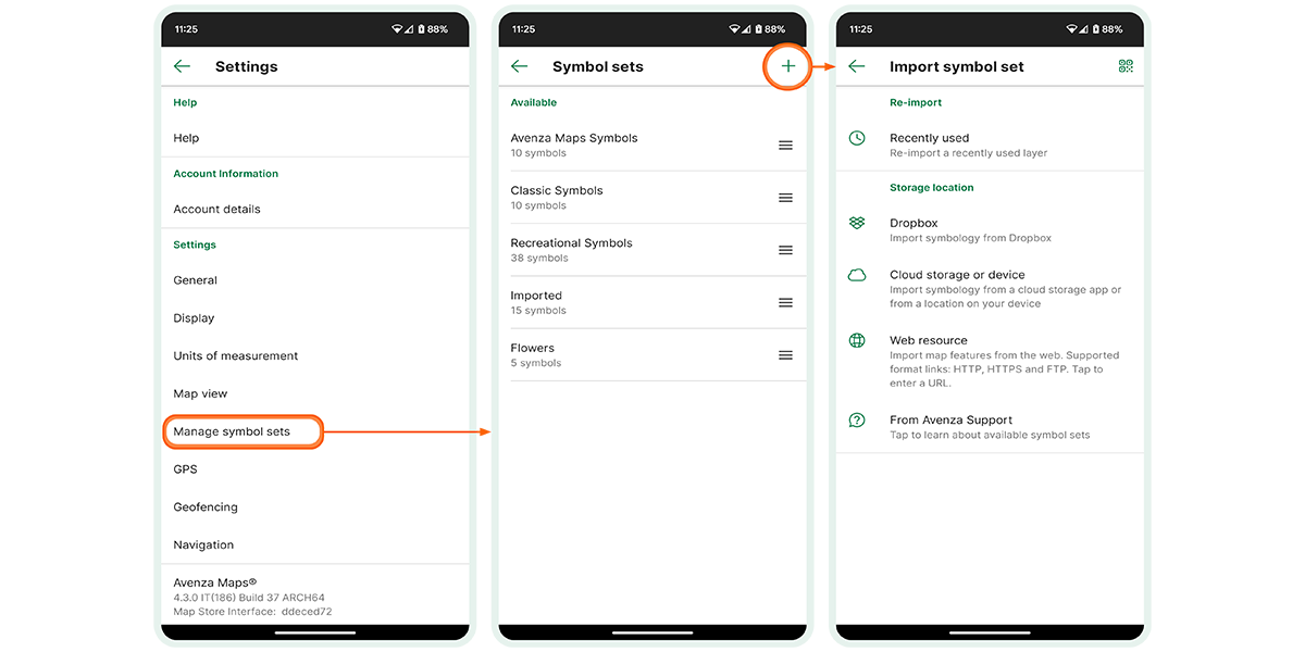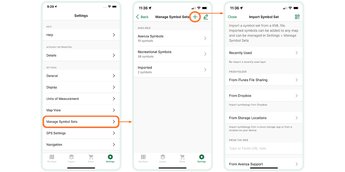 First, access the Settings section in Avenza Maps to import symbol sets. From there, click on "Manage Symbol Sets." Then, use the "Plus" icon in the top-right corner to select how to import your symbol set files. This import process applies uniformly to both .avenzasymbol files and .kml/kmz files.