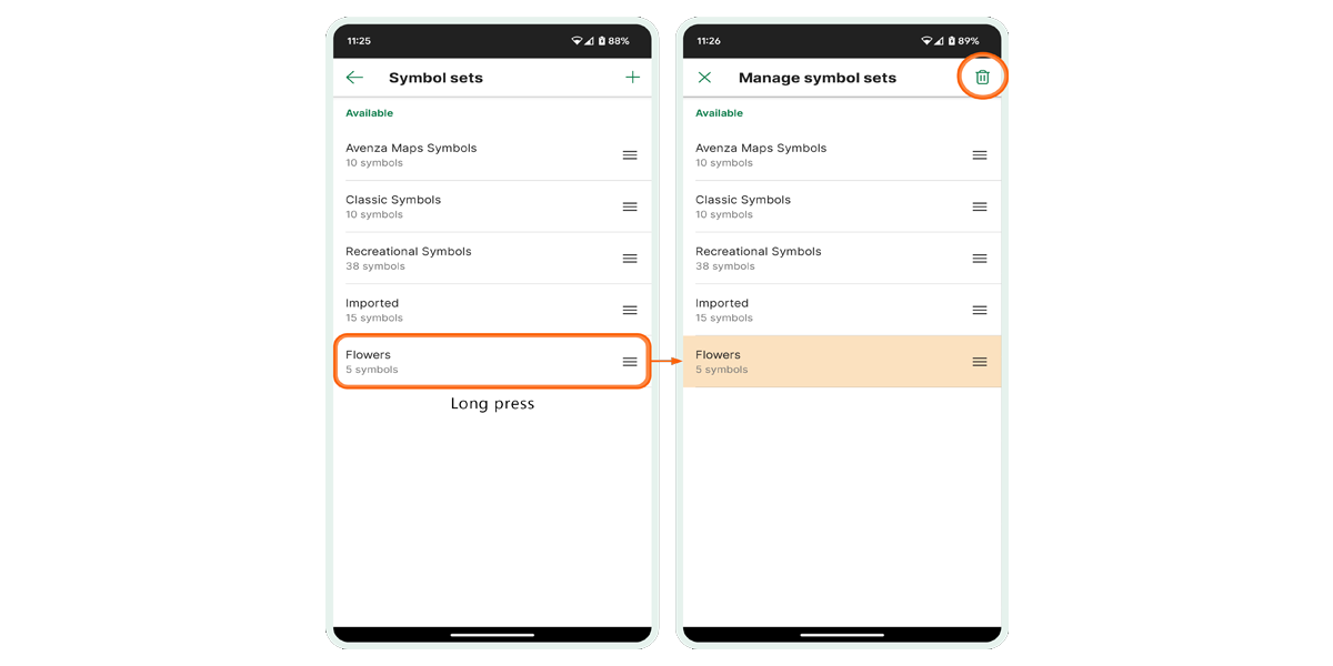 To rearrange the order of imported symbol sets, employ the handles situated on the right of each symbol set. Simply press and drag a set to a different position. Additionally, if you wish to delete an imported symbol set, perform a prolonged press on the set until it turns orange and then tap on the "DeleteIcon.PNG" to eliminate it.