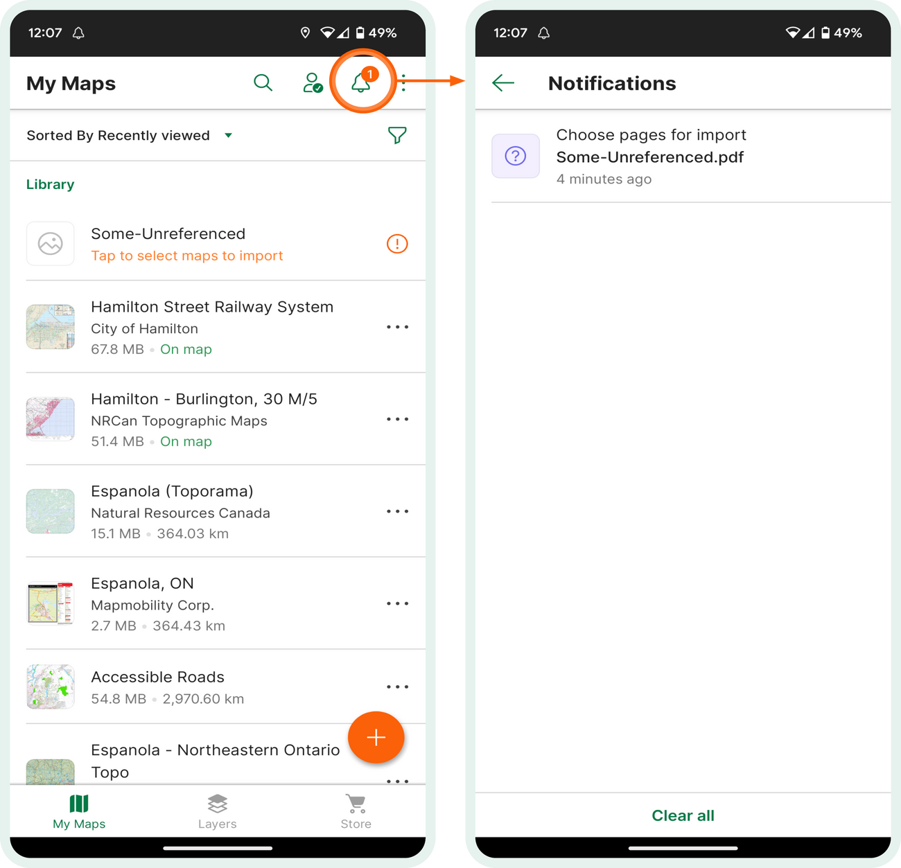 Access the "Add" option represented by the orange plus icon for Android users or green Import Icon for iOS users on the My Maps screen, then select "download or import a map." The subsequent process for importing a single map remains the same. Users can import multi-page PDFs from any of our currently supported sources.