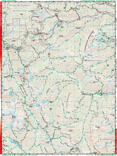 The 400,000-plus acre Alpine Lakes Wilderness teems with hundreds of sparkling backcountry lakes, deep glaciated valleys cloaked with old-growth forests, hundreds of snow and glacier capped peaks and miles of meadows that burst with dazzling blossoms throughout the summer. This map covers the hea...