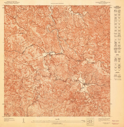 A 1947 historical topographic map of Adjuntas NW in Puerto Rico produced by the United States Geological Survey (USGS). It shows contour lines, place names, water bodies and roads. Map services and data available from U.S. Geological Survey, National Geospatial Program. Map was obtained from http...