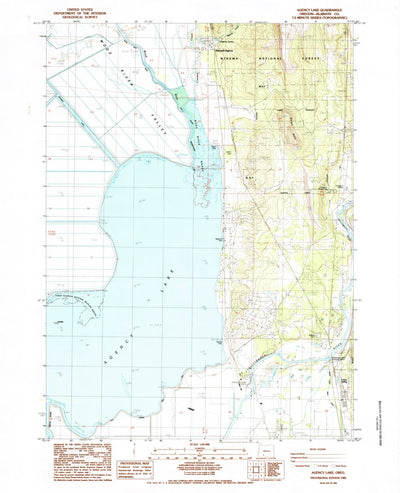 A 1985 historical topographic map of Agency Lake in Oregon produced by the United States Geological Survey (USGS). It shows contour lines, place names, water bodies and roads. Map services and data available from U.S. Geological Survey, National Geospatial Program. Map was obtained from https://w...