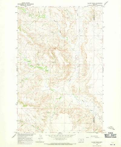 A 1966 historical topographic map of Allard Ranch in Montana produced by the United States Geological Survey (USGS). It shows contour lines, place names, water bodies and roads. Map services and data available from U.S. Geological Survey, National Geospatial Program. Map was obtained from https:/...