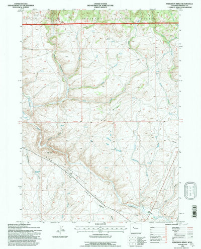 A 1991 historical topographic map of Anderson Ridge in Wyoming produced by the United States Geological Survey (USGS). It shows contour lines, place names, water bodies and roads. Map services and data available from U.S. Geological Survey, National Geospatial Program. Map was obtained from https...