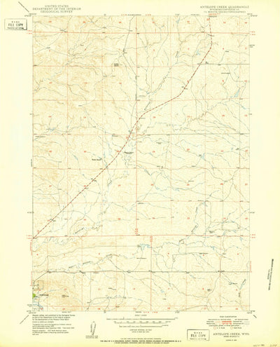 A 1950 historical topographic map of Antelope Creek in Wyoming produced by the United States Geological Survey (USGS). It shows contour lines, place names, water bodies and roads. Map services and data available from U.S. Geological Survey, National Geospatial Program. Map was obtained from https...