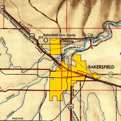 A 1955 historical topographic map of Bakersfield in California produced by the United States Geological Survey (USGS). It shows contour lines, place names, water bodies and roads. Map services and data available from U.S. Geological Survey, National Geospatial Program. Map was obtained from https...