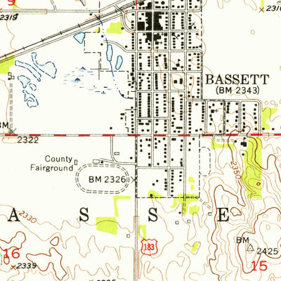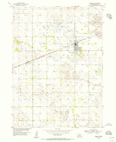 A 1954 historical topographic map of Bassett in Nebraska produced by the United States Geological Survey (USGS). It shows contour lines, place names, water bodies and roads. Map services and data available from U.S. Geological Survey, National Geospatial Program. Map was obtained from https://www...