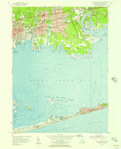 A 1955 historical topographic map of Bay Shore East in New York produced by the United States Geological Survey (USGS). It shows contour lines, place names, water bodies and roads. Map services and data available from U.S. Geological Survey, National Geospatial Program. Map was obtained from http...