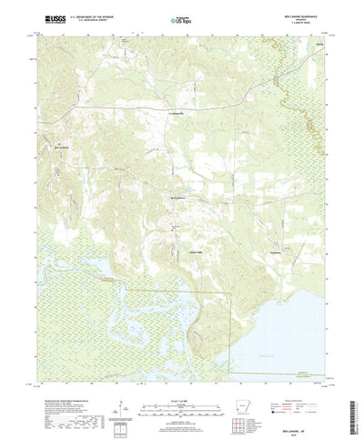 A digital topographic map of Ben Lomond in Arkansas produced by the United States Geological Survey (USGS) in 2020. The map is part of the National Map series of 7.5 minute quadrangle maps. It shows contour lines, place names, water bodies and roads. Map services and data available from U.S. Geol...