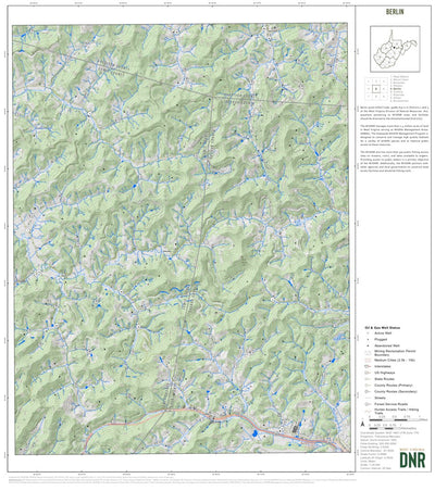 This map was produced using USGS 7.5-minute quadrangles. The maps shows locations of public lands including, but not limited to national forests, state forests, wildlife management areas, and county/city parks in the Berlin quadrangle. The map also shows West Virginia Division of Natural Resource...