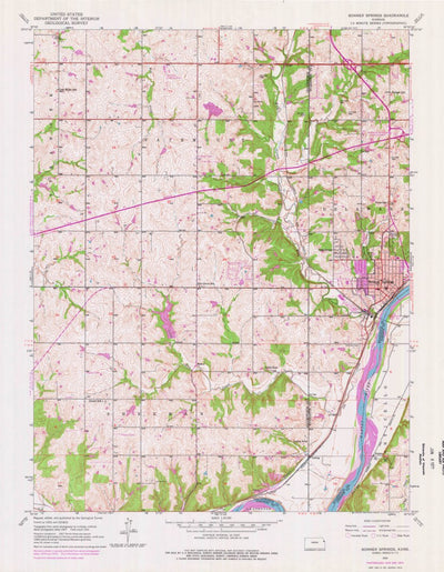 A 1950 historical topographic map of Bonner Springs in Kansas produced by the United States Geological Survey (USGS). It shows contour lines, place names, water bodies and roads. Map services and data available from U.S. Geological Survey, National Geospatial Program. Map was obtained from https:...