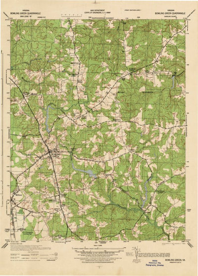 A 1942 historical topographic map of Bowling Green in Virginia produced by the United States Geological Survey (USGS). It shows contour lines, place names, water bodies and roads. Map services and data available from U.S. Geological Survey, National Geospatial Program. Map was obtained from https...