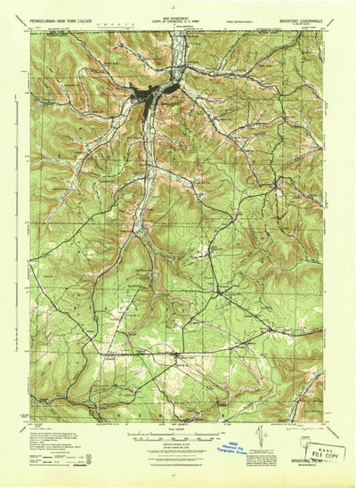 A 1944 historical topographic map of Bradford in Pennsylvania produced by the United States Geological Survey (USGS). It shows contour lines, place names, water bodies and roads. Map services and data available from U.S. Geological Survey, National Geospatial Program. Map was obtained from https:...