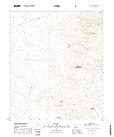 A digital topographic map of Bruno Peak in Arizona produced by the United States Geological Survey (USGS) in 2018. The map is part of the National Map series of 7.5 minute quadrangle maps. It shows contour lines, place names, water bodies and roads. Map services and data available from U.S. Geolo...