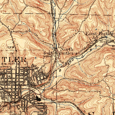 A 1911 historical topographic map of Butler in Pennsylvania produced by the United States Geological Survey (USGS). It shows contour lines, place names, water bodies and roads. Map services and data available from U.S. Geological Survey, National Geospatial Program. Map was obtained from https://...