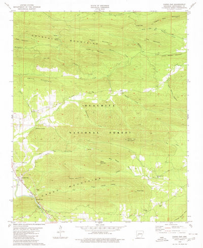 A 1979 historical topographic map of Caddo Gap in Arkansas produced by the United States Geological Survey (USGS). It shows contour lines, place names, water bodies and roads. Map services and data available from U.S. Geological Survey, National Geospatial Program. Map was obtained from https://w...