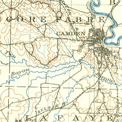 A 1903 historical topographic map of Camden in Arkansas produced by the United States Geological Survey (USGS). It shows contour lines, place names, water bodies and roads. Map services and data available from U.S. Geological Survey, National Geospatial Program. Map was obtained from https://www....