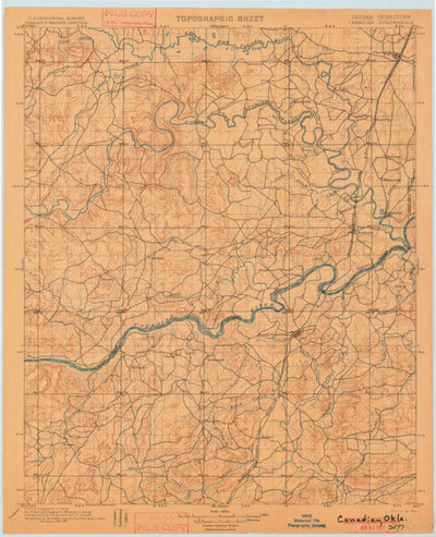 A 1900 historical topographic map of Canadian in Oklahoma produced by the United States Geological Survey (USGS). It shows contour lines, place names, water bodies and roads. Map services and data available from U.S. Geological Survey, National Geospatial Program. Map was obtained from https://ww...
