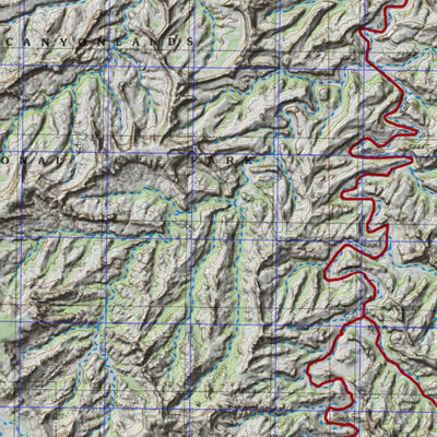 Detailed topo map shows paved roads, dirt roads, hiking trails, and mountain biking trails in and around Canyonlands National Park.