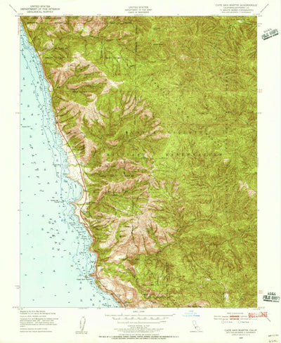 A 1949 historical topographic map of Cape San Martin in California produced by the United States Geological Survey (USGS). It shows contour lines, place names, water bodies and roads. Map services and data available from U.S. Geological Survey, National Geospatial Program. Map was obtained from h...