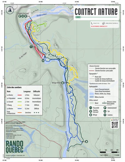 En parcourant les différents sentiers de ce réseau, on longera le canyon de la rivière à Mars, où on pourra parfois admirer des arcs-en-ciel. On pourra traverser la rivière par une passerelle suspendue. On atteindra un belvédère offrant une vue sur un lac, une chute et les vestiges d'un vieux bar...