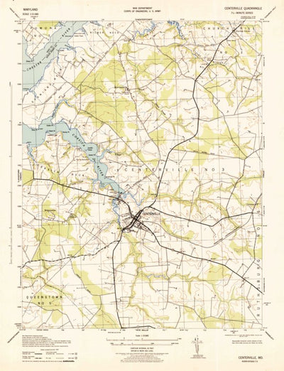 A 1943 historical topographic map of Centreville in Maryland produced by the United States Geological Survey (USGS). It shows contour lines, place names, water bodies and roads. Map services and data available from U.S. Geological Survey, National Geospatial Program. Map was obtained from https:/...