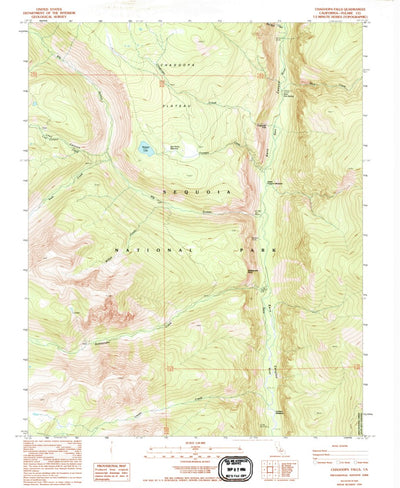 A 1988 historical topographic map of Chagoopa Falls in California produced by the United States Geological Survey (USGS). It shows contour lines, place names, water bodies and roads. Map services and data available from U.S. Geological Survey, National Geospatial Program. Map was obtained from ht...