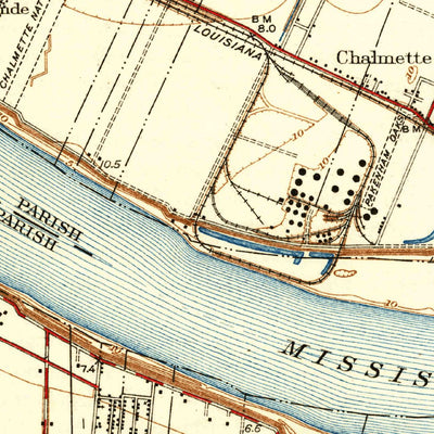 A 1939 historical topographic map of Chalmette in Louisiana produced by the United States Geological Survey (USGS). It shows contour lines, place names, water bodies and roads. Map services and data available from U.S. Geological Survey, National Geospatial Program. Map was obtained from https://...