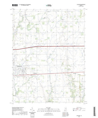 A digital topographic map of Cleveland in Indiana produced by the United States Geological Survey (USGS) in 2022. The map is part of the National Map series of 7.5 minute quadrangle maps. It shows contour lines, place names, water bodies and roads. Map services and data available from U.S. Geolog...