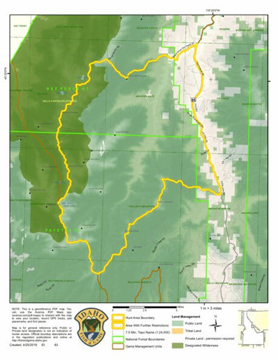 This map is part of the 2019 Hunt Area Map Index produced by the Idaho Department Fish & Game and uploaded to Avenza with full permission from the department. This map depicts the Controlled Hunt Areas for Elk in Hunt Area 23-2, which encompasses That portion of Unit 23 west of U.S. 95 and no...