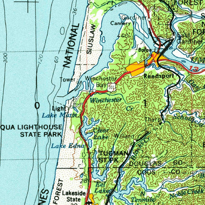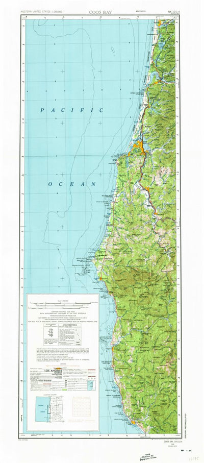 A 1958 historical topographic map of Coos Bay in Oregon produced by the United States Geological Survey (USGS). It shows contour lines, place names, water bodies and roads. Map services and data available from U.S. Geological Survey, National Geospatial Program. Map was obtained from https://www....