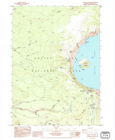 A 1985 historical topographic map of Crater Lake West in Oregon produced by the United States Geological Survey (USGS). It shows contour lines, place names, water bodies and roads. Map services and data available from U.S. Geological Survey, National Geospatial Program. Map was obtained from http...