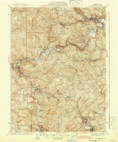 A 1942 historical topographic map of Curwensville in Pennsylvania produced by the United States Geological Survey (USGS). It shows contour lines, place names, water bodies and roads. Map services and data available from U.S. Geological Survey, National Geospatial Program. Map was obtained from ht...