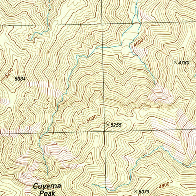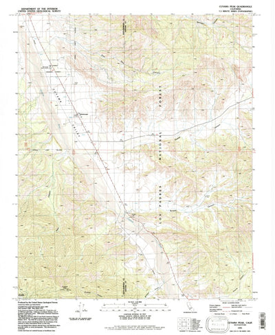 A 1991 historical topographic map of Cuyama Peak in California produced by the United States Geological Survey (USGS). It shows contour lines, place names, water bodies and roads. Map services and data available from U.S. Geological Survey, National Geospatial Program. Map was obtained from https...