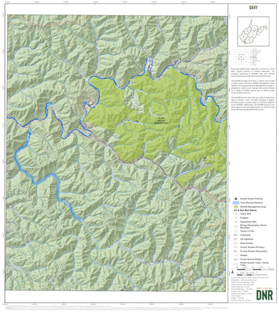 This map was produced using USGS 7.5-minute quadrangles. The maps shows locations of public lands including, but not limited to national forests, state forests, wildlife management areas, and county/city parks in the Davy quadrangle. The map also shows West Virginia Division of Natural Resource i...