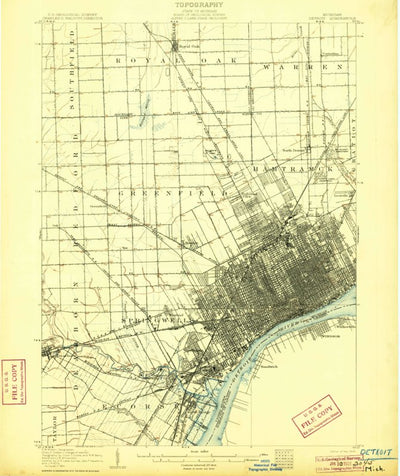 A 1905 historical topographic map of Detroit in Michigan produced by the United States Geological Survey (USGS). It shows contour lines, place names, water bodies and roads. Map services and data available from U.S. Geological Survey, National Geospatial Program. Map was obtained from https://www...