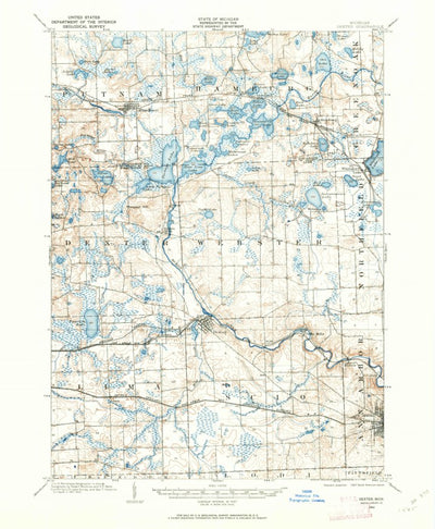 A 1902 historical topographic map of Dexter in Michigan produced by the United States Geological Survey (USGS). It shows contour lines, place names, water bodies and roads. Map services and data available from U.S. Geological Survey, National Geospatial Program. Map was obtained from https://www....