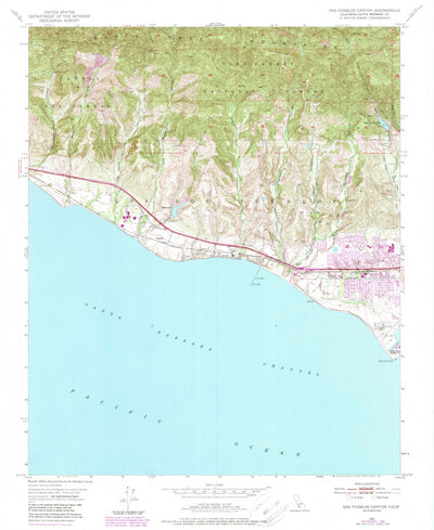A 1951 historical topographic map of Dos Pueblos Canyon in California produced by the United States Geological Survey (USGS). It shows contour lines, place names, water bodies and roads. Map services and data available from U.S. Geological Survey, National Geospatial Program. Map was obtained fro...