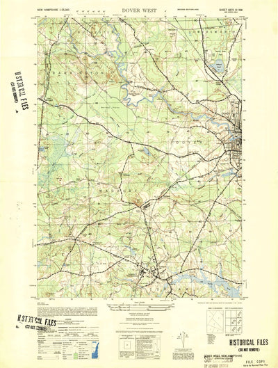A 1952 historical topographic map of Dover West in New Hampshire produced by the United States Geological Survey (USGS). It shows contour lines, place names, water bodies and roads. Map services and data available from U.S. Geological Survey, National Geospatial Program. Map was obtained from htt...