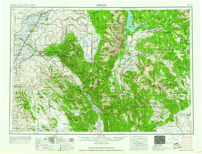 A 1958 historical topographic map of Driggs in Idaho produced by the United States Geological Survey (USGS). It shows contour lines, place names, water bodies and roads. Map services and data available from U.S. Geological Survey, National Geospatial Program. Map was obtained from https://www.sci...
