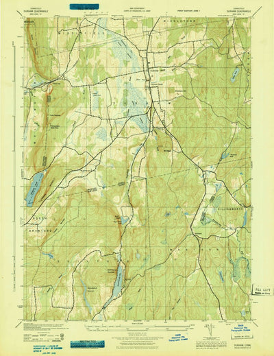 A 1943 historical topographic map of Durham in Connecticut produced by the United States Geological Survey (USGS). It shows contour lines, place names, water bodies and roads. Map services and data available from U.S. Geological Survey, National Geospatial Program. Map was obtained from https://w...