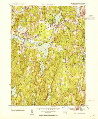 A 1954 historical topographic map of East Brookfield in Massachusetts produced by the United States Geological Survey (USGS). It shows contour lines, place names, water bodies and roads. Map services and data available from U.S. Geological Survey, National Geospatial Program. Map was obtained fro...