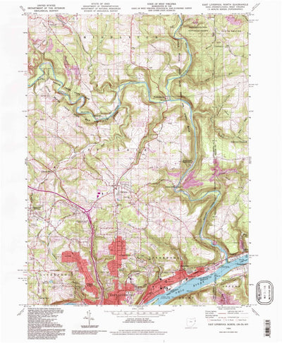 A 1994 historical topographic map of East Liverpool North in Ohio produced by the United States Geological Survey (USGS). It shows contour lines, place names, water bodies and roads. Map services and data available from U.S. Geological Survey, National Geospatial Program. Map was obtained from ht...