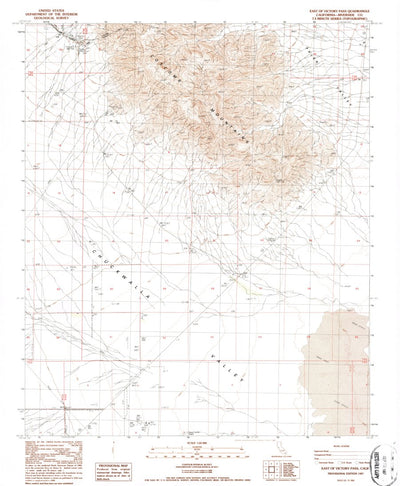 A 1987 historical topographic map of East Of Victory Pass in California produced by the United States Geological Survey (USGS). It shows contour lines, place names, water bodies and roads. Map services and data available from U.S. Geological Survey, National Geospatial Program. Map was obtained f...