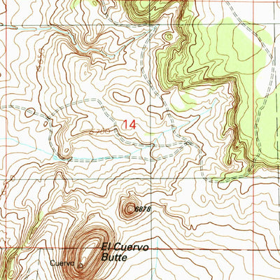 A 1990 historical topographic map of El Cuervo Butte in New Mexico produced by the United States Geological Survey (USGS). It shows contour lines, place names, water bodies and roads. Map services and data available from U.S. Geological Survey, National Geospatial Program. Map was obtained from h...