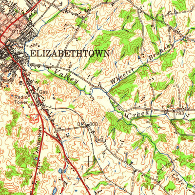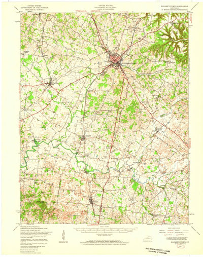 A 1949 historical topographic map of Elizabethtown in Kentucky produced by the United States Geological Survey (USGS). It shows contour lines, place names, water bodies and roads. Map services and data available from U.S. Geological Survey, National Geospatial Program. Map was obtained from https...