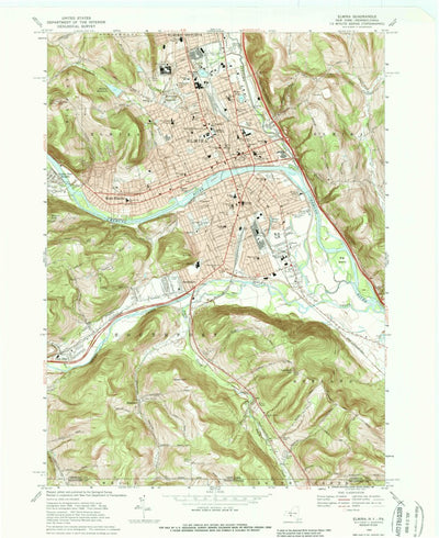 A 1969 historical topographic map of Elmira in New York produced by the United States Geological Survey (USGS). It shows contour lines, place names, water bodies and roads. Map services and data available from U.S. Geological Survey, National Geospatial Program. Map was obtained from https://www....
