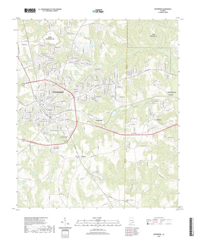 A digital topographic map of Enterprise in Alabama produced by the United States Geological Survey (USGS) in 2020. The map is part of the National Map series of 7.5 minute quadrangle maps. It shows contour lines, place names, water bodies and roads. Map services and data available from U.S. Geolo...
