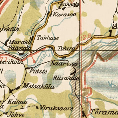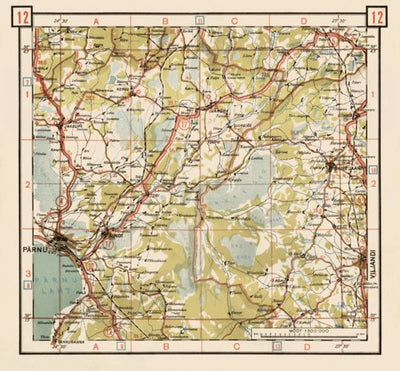 Old vintage map of the west Estonia between Pärnu, Suure-Jaani and Viljandi from 1938, located in Estonia, produced by Maanteede talituse väljaanne, at the scale of 1:300,000. This digitally re-mastered image is a part of the Discus Media 1900 Collection.