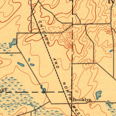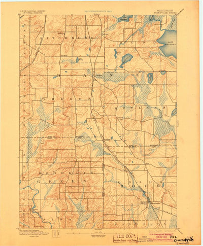 A 1894 historical topographic map of Evensville in Wisconsin produced by the United States Geological Survey (USGS). It shows contour lines, place names, water bodies and roads. Map services and data available from U.S. Geological Survey, National Geospatial Program. Map was obtained from https:/...